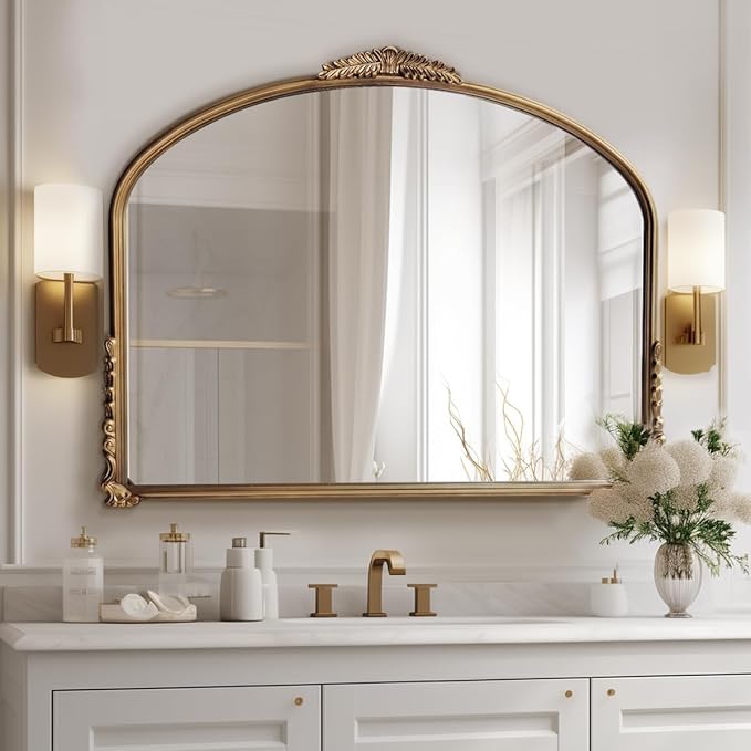 This 37″ x 29″ arched mirror features an ornate baroque design with a vintage gold finish, blending antique charm with artistic elegance. Its 4mm HD glass ensures clear, true-to-life reflections, while the explosion-proof membrane adds safety.